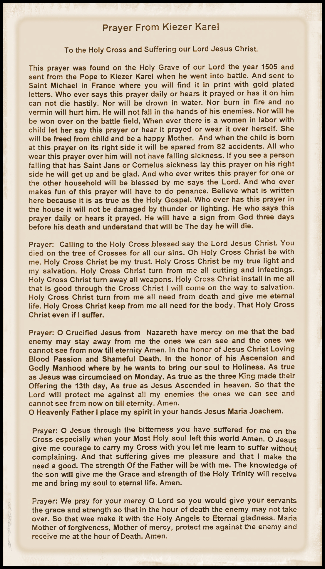 Before Sergeant Frank DeClerck left his home in World War II to join the 117th Infantry Regiment, his mother gave him the "Prayer of Kiezer Karel." It was actually at set of four prayers. His mother hand wrote the four prayers for Frank in Flemish, a form of Dutch. Carrying a copy of this prayer would to help alleviate any pain of suffering if he was wounded or dying in battle. This was a Flemish tradition passed on in their new country, America. Sgt. DeClerck always carried the prays with him thought-out Europe in World War II.