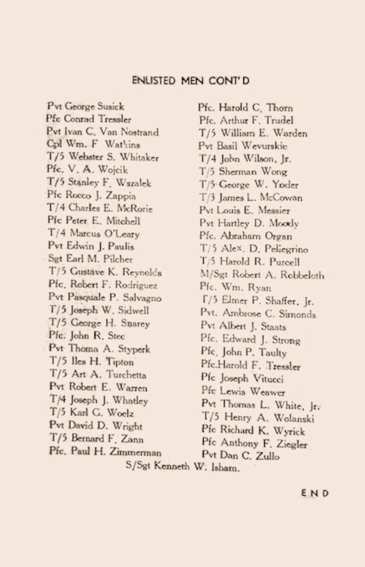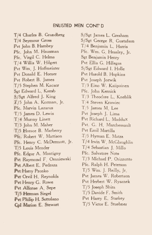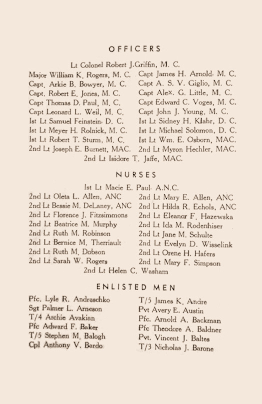 The 32nd Field Hospital 1943 Christmas Menu Booklet was provided by Gary Marchessault. His father was PFC George Marchessault. The booklet was printed for the 32nd's first Christmas overseas. The unit was formed in the Spring of 1943 and had 218 members before it left for Oran, Algeria, and then later to Italy that Fall. The 32nd arrived in Caserta, Italy, in October and established a "Fixed" hospital there. Two smaller elements of the 32nd were placed in "Station" hospitals in other locations nearby. These smaller elements probably re-joined the main hospital at Caserta on December 25. The booklet lists 225 members, an increase of 7 over the number that had initially arrived in Italy. The following are the 6 pages from the booklet.