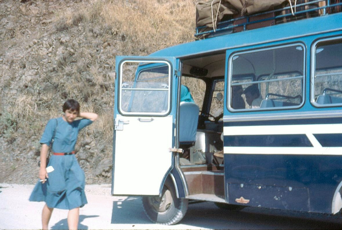 Barb Mann near bus for a trip, Christmas 1964.
