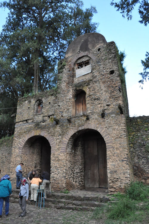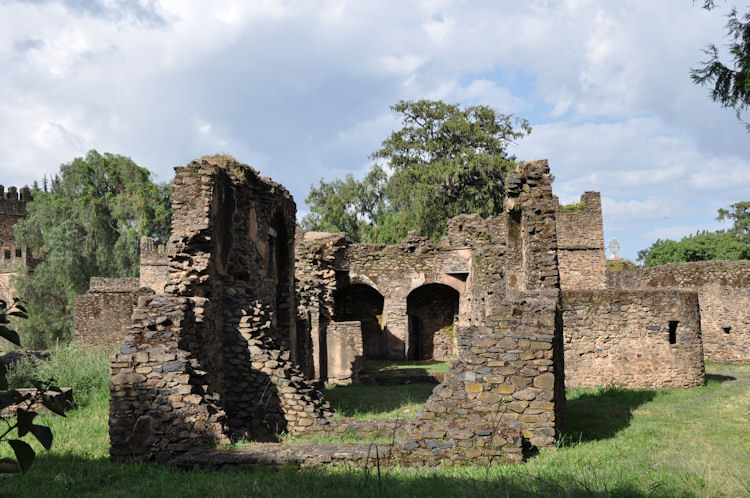 This complex of buildings includes Fasilides castle, Iyasu's Palace, Dawit's Hall, a banqueting hall, stables, Mentewab's Castle, a chancellery, library and three churches: Asasame Qeddus Mikael, Elfin Giyorgis and Gemjabet Mariyam.